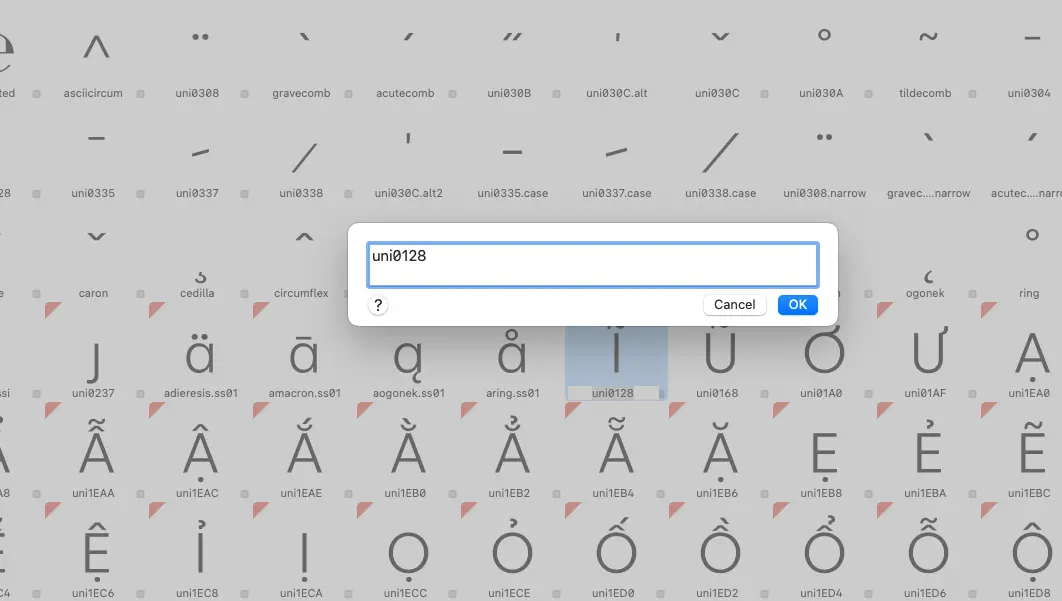 Bạn đặt tên cho Glyph bằng mã Unicode của ký tự, ở đây là uni0128.