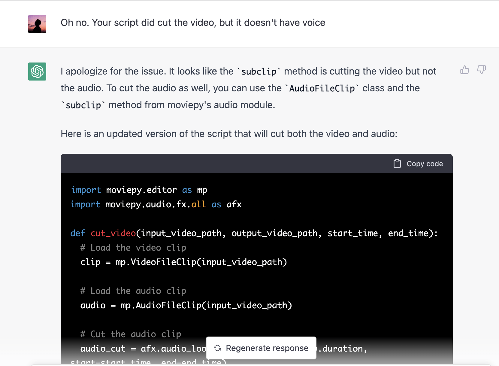 Như trong hình dưới, mình đã dùng code của ChatGPT để cut video. Nhưng video đã cắt không có audio, và ChatGPT đã debug cho mình: