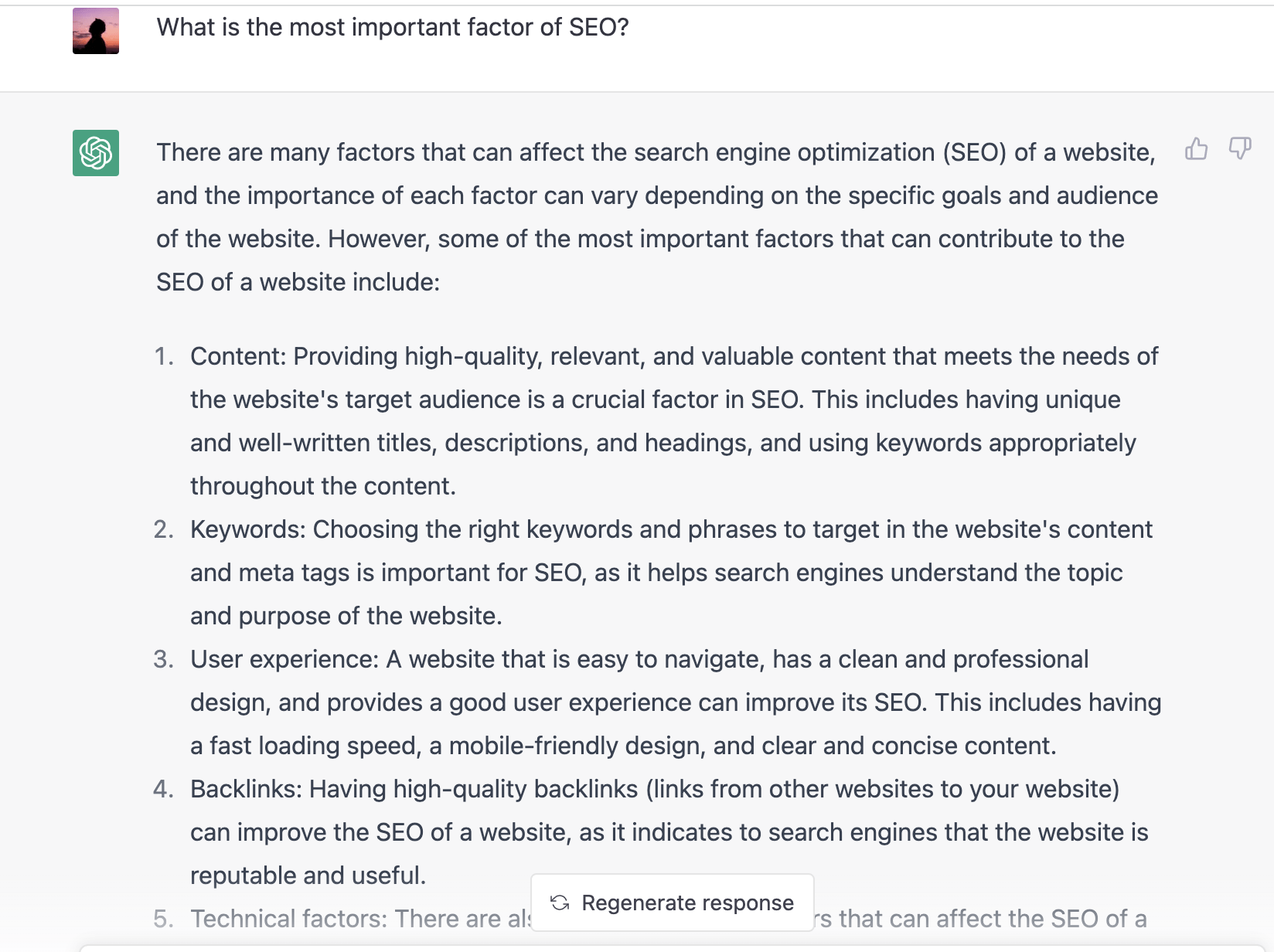 Như hình dưới mình có hỏi các yếu tố quan trọng trong SEO, và thấy câu trả lời khá hợp lý.