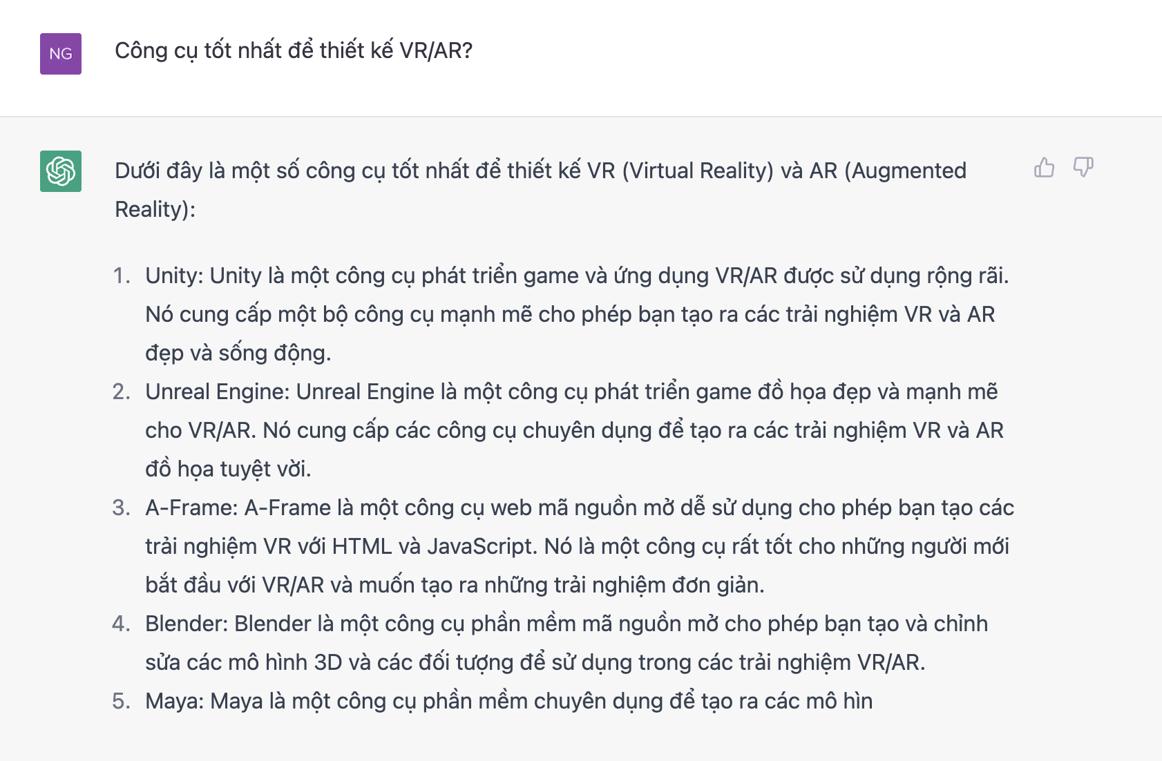 Hỏi công cụ nào được sử dụng cho các mục đích thiết kế cụ thể (như AR hoặc VR) và ChatGPT sẽ đề xuất một số giải pháp.